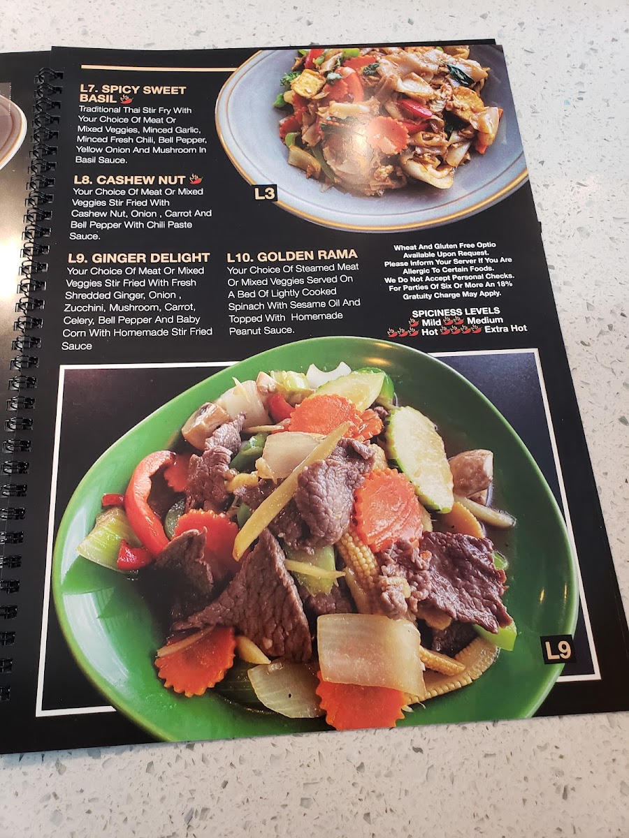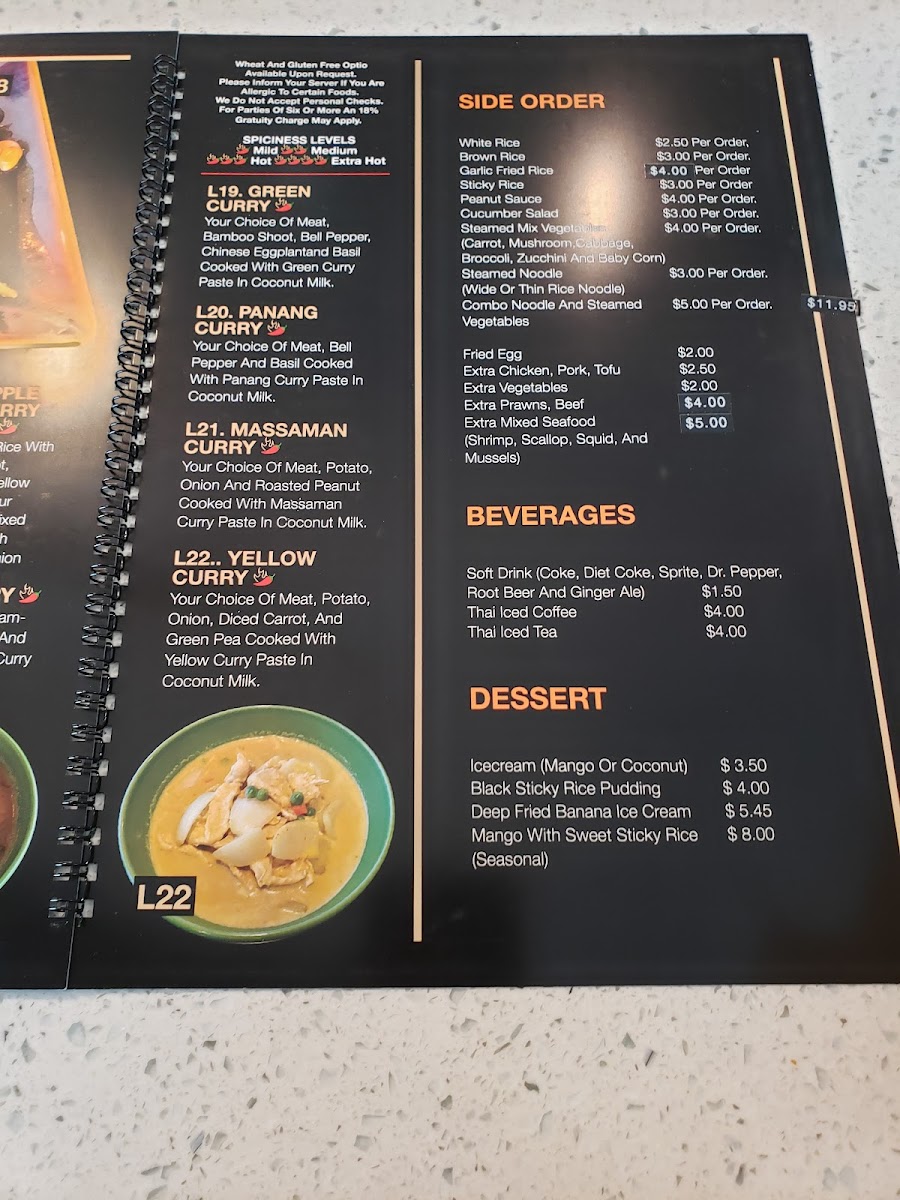 You'll find popular options like Chicken Pad Thai, Panang Curry, and Spicy Sweet Basil among the highlights, alongside satisfying sides such as garlic fried rice or refreshing cucumber salad. The menu also includes warm curries that balance coconut richness with fragrant spices—perfect for those seeking a flavorful, filling meal.